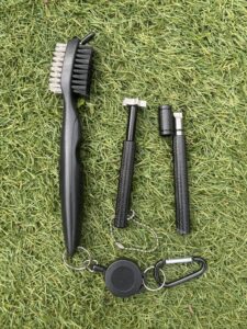 Vieze clubs kunnen je spel enorm beïnvloeden. Zand en gras kunnen de vlucht van je bal veranderen, en als de groeven op je club vol zitten met vuil, kunnen ze geen goede backspin meer op de bal zetten. Een simpele schoonmaakborstel zorgt ervoor dat je clubs hun werk kunnen doen: grip op de bal, beter contact en meer controle.